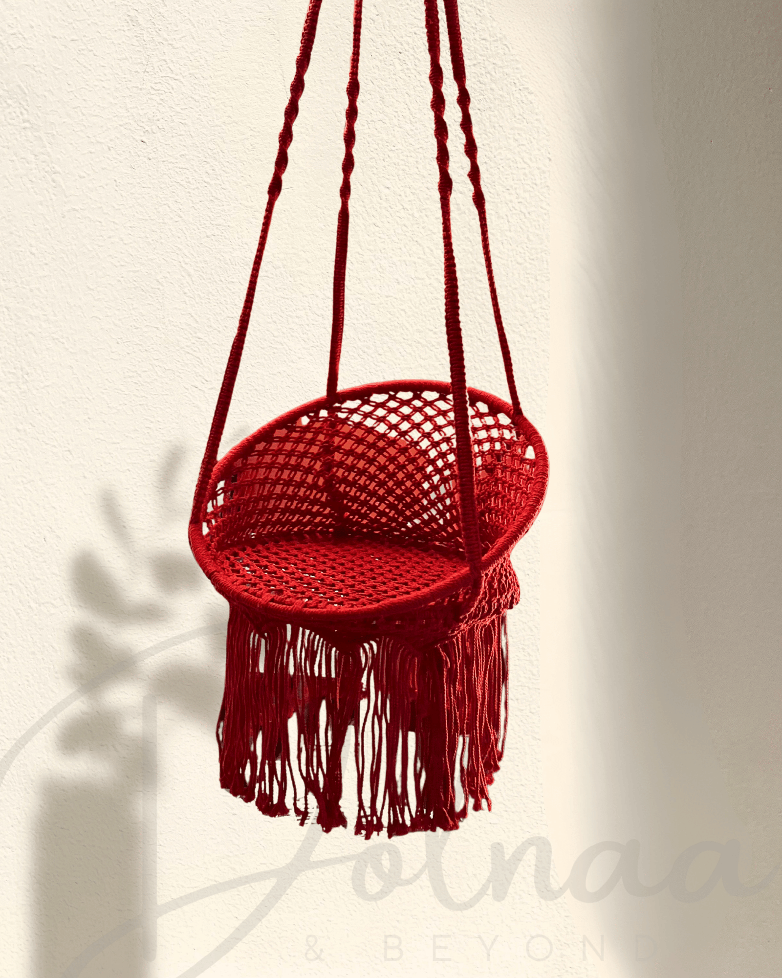 Bring timeless charm into your space with the Crimson Macramé Hammock Swing, an artisanal masterpiece woven with passion and precision. Designed for comfort and style, this handcrafted swing is made with durable cotton cord in a deep crimson hue, finished with signature macramé fringes for a bohemian yet premium aesthetic.