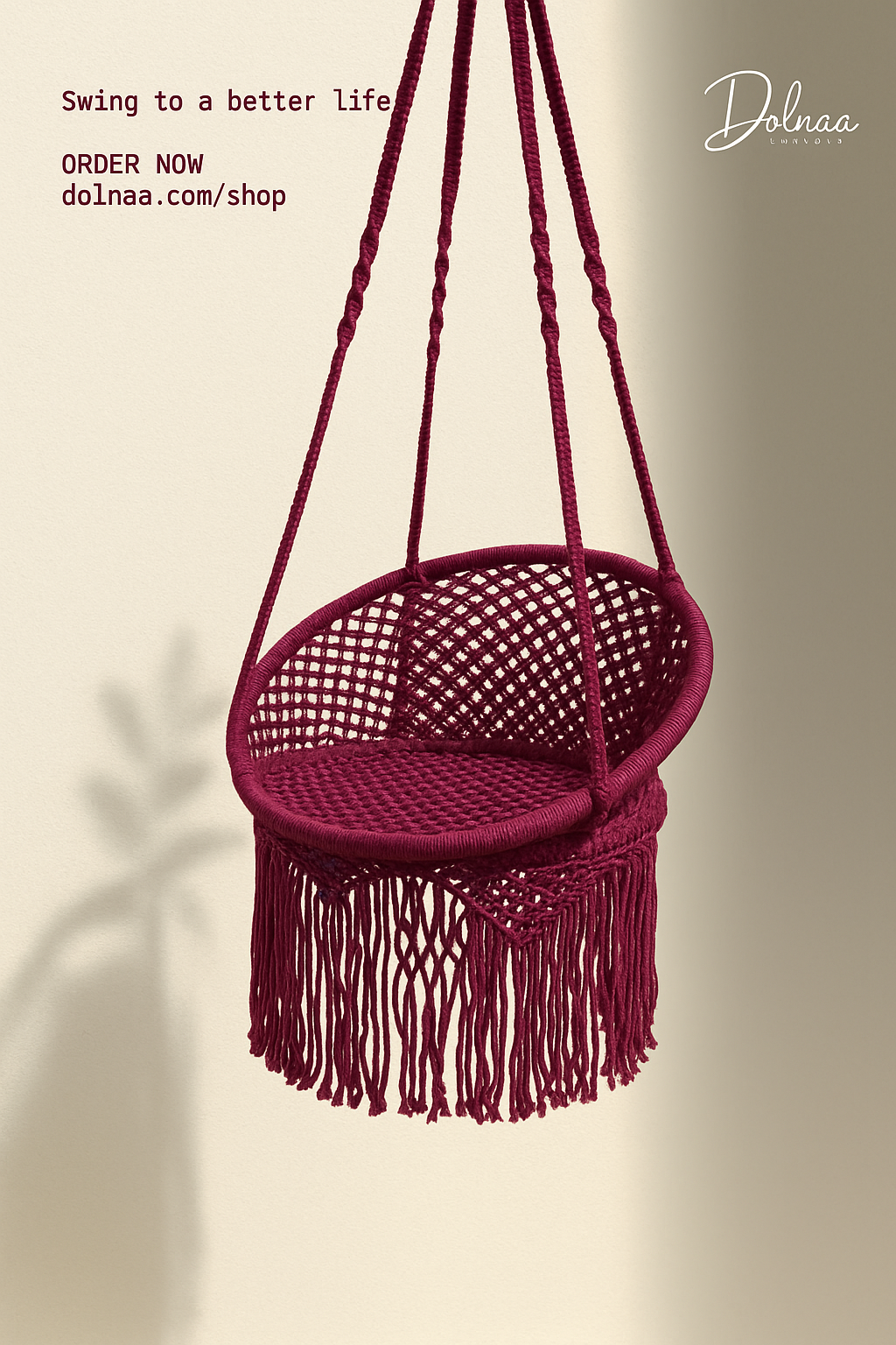 Bring timeless charm into your space with the Lady-Pink Macramé Dolnaa – 22 x 25″, an artisanal masterpiece woven with passion and precision. Designed for comfort and style, this handcrafted swing is made with durable cotton cord in a deep crimson hue, finished with signature macramé fringes for a bohemian yet premium aesthetic.
