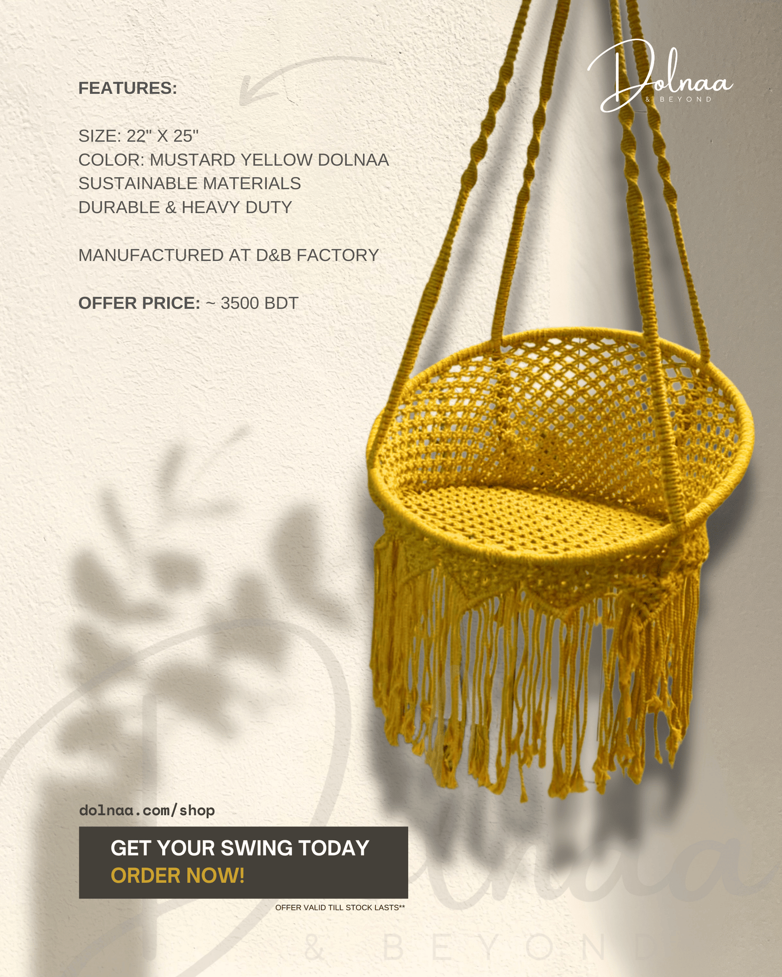 Escape the everyday and “Swing to a better life!” with the Dolnaa & Beyond Mustard Yellow Swing. This beautifully crafted swing is more than just a piece of furniture; it’s an invitation to relax, unwind, and create your own personal sanctuary. The vibrant mustard yellow color adds a touch of modern elegance and warmth to any indoor or outdoor space, perfect for curling up with a good book or simply enjoying a quiet moment.